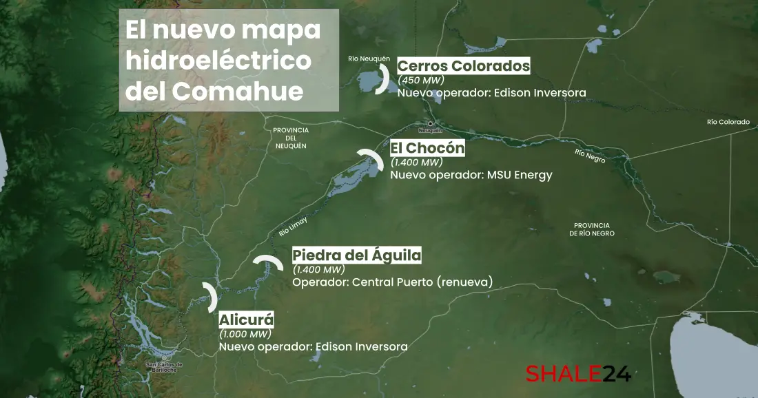 - El Chocón-Arroyito (1.418 MW): Consorcio liderado por BML Inversora S.A.U. y MSU Green Energy (del empresario Manuel Santos Uribelarrea), por USD 235,7 millones. Un grupo que ya ha invertido en distribución y generación en otras provincias.