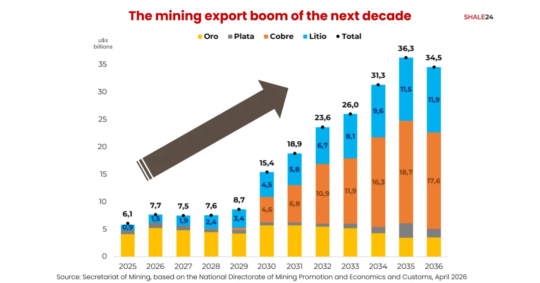 Copper is the headline variable. After recording marginal exports of just $13 million in 2025, the red metal is projected to climb to $4.62 billion by 2030 and to consolidate at $18.71 billion by 2035, accounting for more than 50% of Argentina's total mining exports.