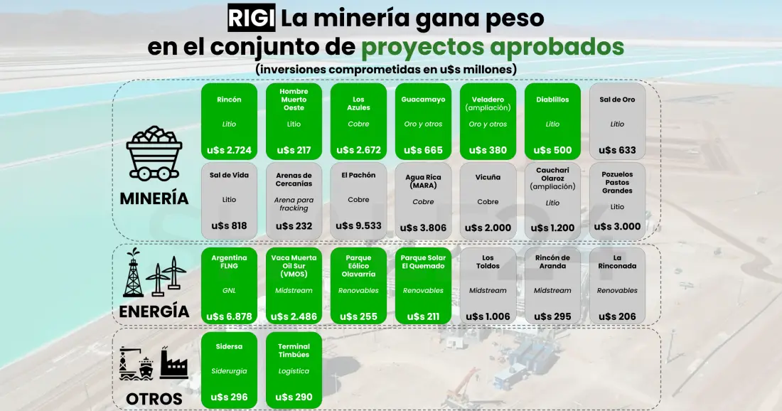 Altogether, the 12 approved projects represent more than $26 billion in investment commitments, according to Argentina’s Ministry of Economy. Within that total, mining accounts for the bulk of the capital committed under the program.