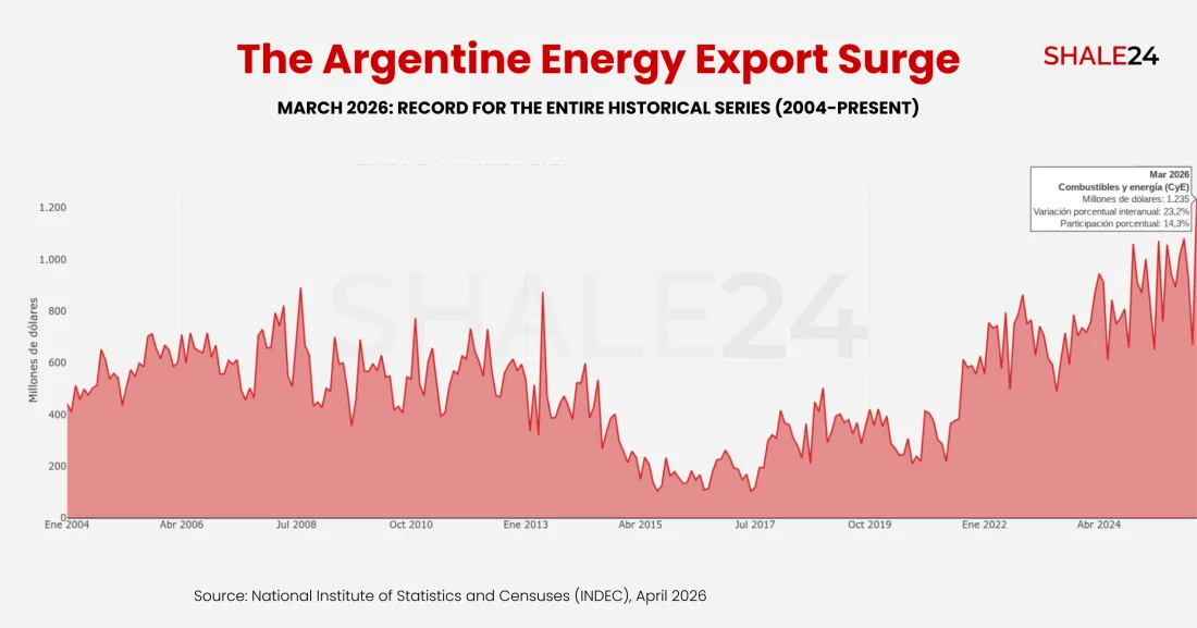 Argentina's energy trade balance posted a record $1.09 billion surplus in March, as fuel and energy exports climbed 23.2% year-on-year to $1.24 billion, the largest monthly total since records began.