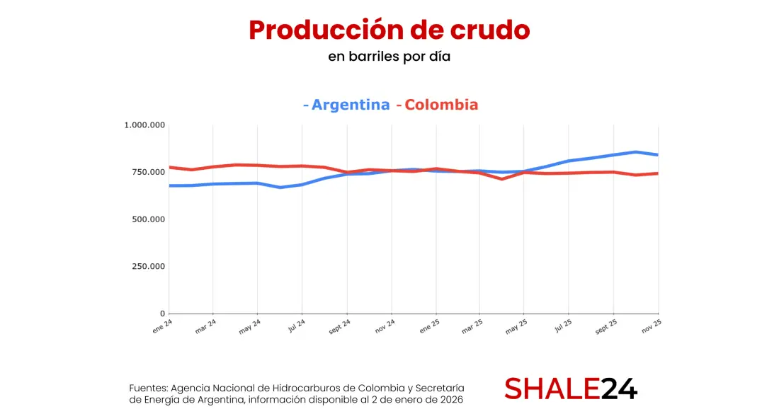 The figure is even more significant in the current regional context, as this production level exceeds Colombia’s output and places Argentina close to Guyana, which is estimated to have closed 2025 with an average of about 750,000 bpd.