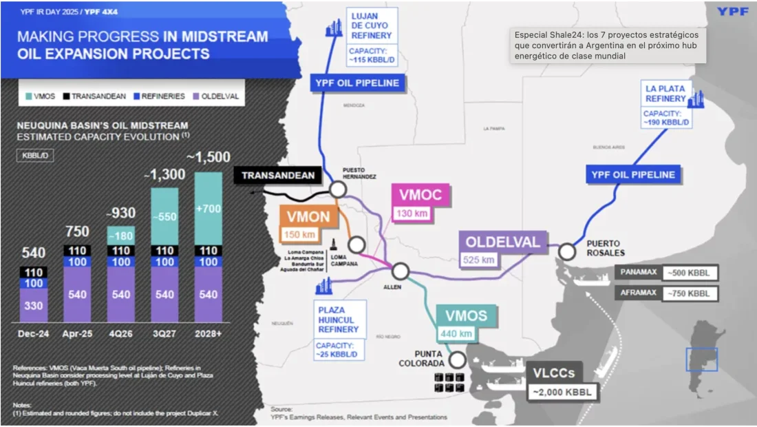 December 2026 is the pivot point. Before that date, crude infrastructure operates at its limits and manages the transition. After it — with the VMOS operational and Duplicar Norte at full capacity — Vaca Muerta will have the network to support output well above one million barrels per day, with all crude reaching the Atlantic coast via routes that bypass strategic maritime chokepoints including the Strait of Hormuz and the Suez Canal.