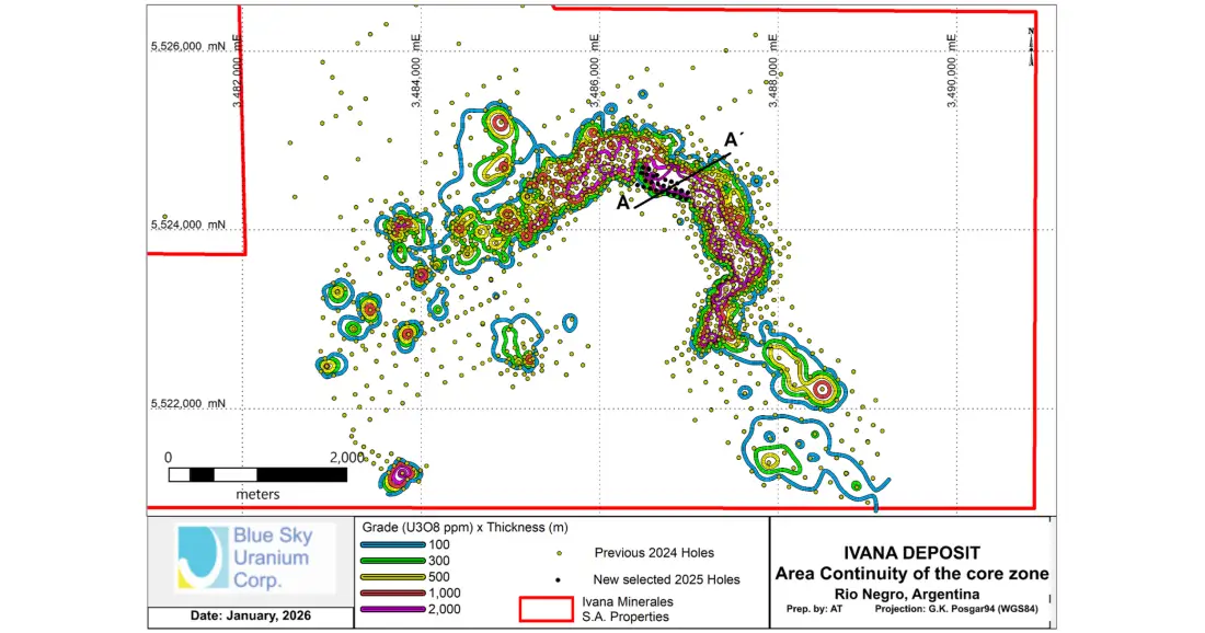 Blue Sky Uranium Corp. e Ivana Minerales S.A. («IMSA», la compañía operadora de la empresa conjunta entre Blue Sky y una subsidiaria de Corporación América Group) presentaron los detalles sobre la nueva área de mineralización de uranio de alta ley dentro y en las inmediaciones del núcleo del yacimiento de uranio Ivana, en el Proyecto Amarillo Grande, en el centro de la Provincia de Río Negro.