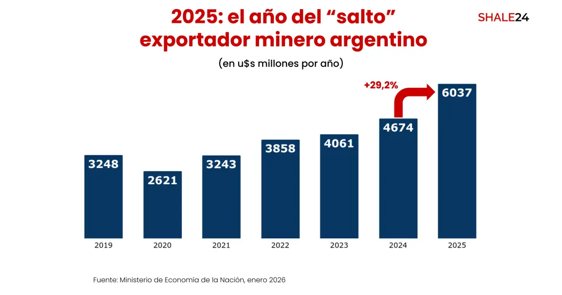 Durante el período enero-diciembre de 2025, las exportaciones mineras argentinas totalizaron u$s6.037 millones, representando el valor más alto de la historia del sector en Argentina. Así lo informó el Ministerio de Economía de la Nación en un reciente comunicado.