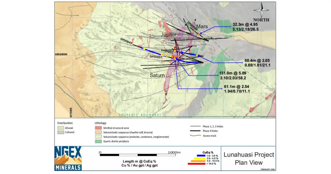 NGEx Minerals anunció los resultados de la perforación de 4 pozos del programa de perforación de Fase 4 que se encuentra en curso en su proyecto Lunahuasi (cobre-oro-plata de alta ley) ubicado en la provincia de San Juan.