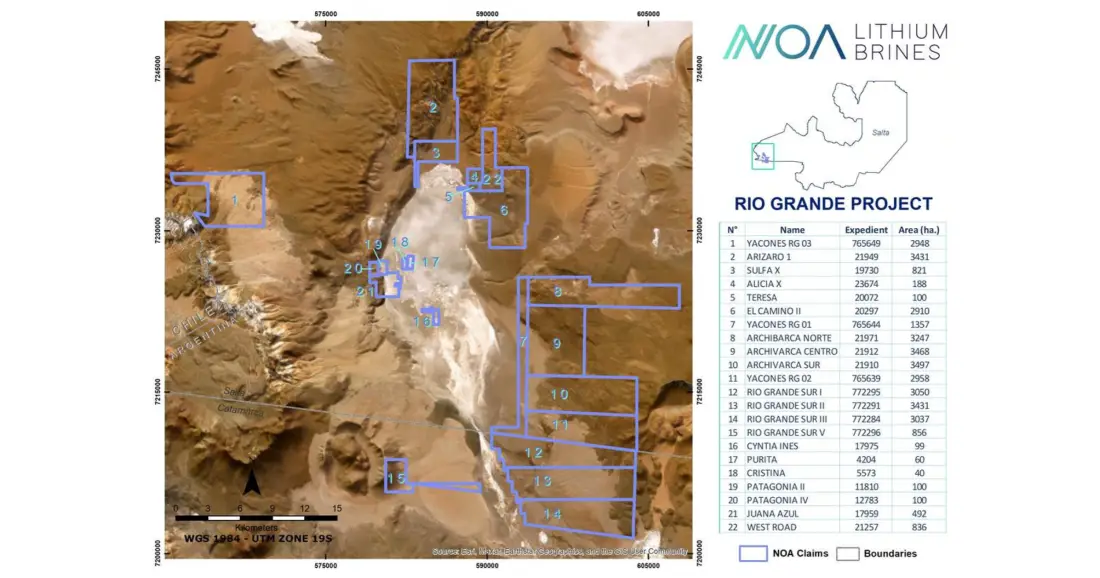 La magnitud de lo que NOA Lithium apunta a desarrollar en Río Grande se comprende mejor al analizar sus activos: la compañía logró consolidar uno de los portfolios de concesiones más extensos de la región que aún no pertenece a ninguna productora en operación, sumando más de 140 mil hectáreas distribuidas en los salares de Río Grande, Arizaro y Salinas Grandes.