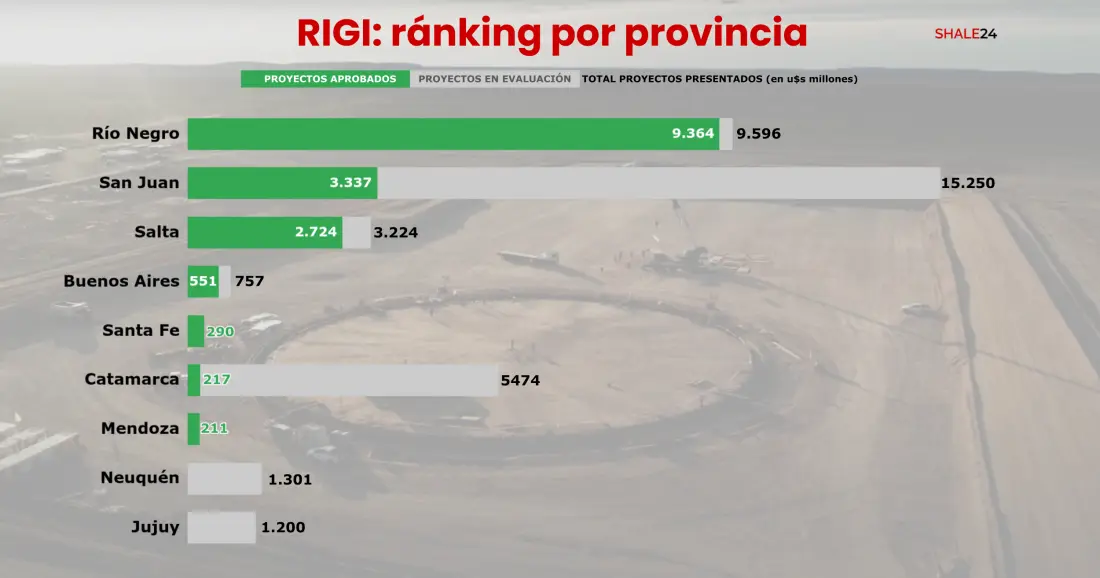 Si bien hoy la Provincia de Río Negro concentra más de la mitad del monto de inversiones por proyectos adheridos al RIGI (con 2 proyectos de gran escala como VMOS y Argentina LNG), la Provincia de San Juan va camino a arrebatarle el primer puesto, de aprobarse los 3 proyectos que aún se encuentran en fase de evaluación (Vicuña, El Pachón, ampliación de Veladero).