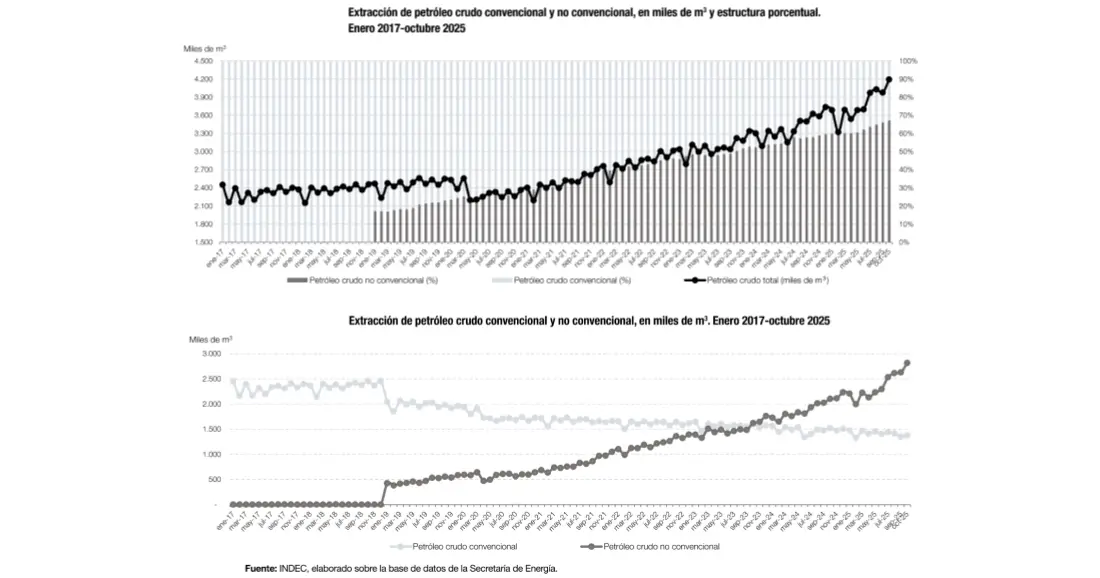 En Argentina hoy el "no convencional" es la nueva norma: en octubre se extrajeron más de 2.800 miles de metros cúbicos de shale oil, duplicando cómodamente a la producción tradicional. En lo que va de 2025, el sector petrolero ya acumula un crecimiento del 12,9%.