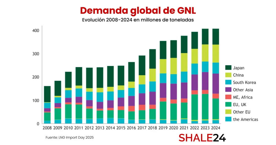Japón es el segundo mayor importador mundial de GNL, detrás de China, y su matriz energética sigue mostrando una alta dependencia de este recurso. En los primeros tres meses de 2025, importó 17.67 millones de toneladas, un 13% más que China en el mismo período. En octubre de 2025, las importaciones crecieron 10,5% interanual, impulsadas por el restocking pre-invierno, con un costo de u$s3,04 mil millones.