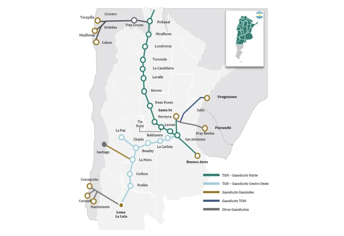 El esquema es brownfield: no parte de infraestructura nueva sino de activos existentes. CGC tiene una participación indirecta del 28% en TGN —a través de Gasinvest, sociedad que controla el 56,35% de la transportista— y el 43,5% directo en Gas Andes Argentina y Gas Andes Chile. Este gasoducto une La Mora, en Mendoza, con Santiago en 533 kilómetros, con una capacidad de transporte de 10,8 millones de metros cúbicos diarios.