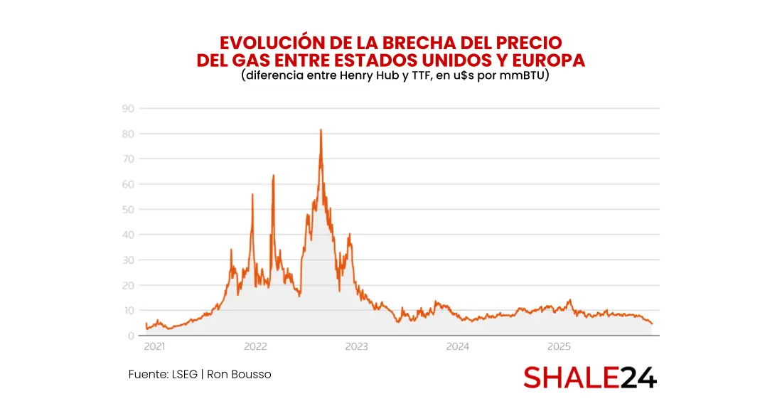 En un contexto de abundancia global de gas natural licuado (GNL), las exportaciones de GNL desde Estados Unidos hacia Europa enfrentan una presión creciente por la reducción del diferencial de precios entre el Henry Hub (HH, referencia en EE.UU.) y el TTF (referencia en Europa). Este “spread” cayó a unos u$s4,70 por millón de unidades térmicas británicas (MMBtu), el nivel más bajo desde abril de 2021, lo que está erosionando los márgenes de ganancia de los exportadores estadounidenses. Si esta tendencia persiste, podría llevar a una reducción en las exportaciones, con impactos en la economía energética de ambos continentes y en la seguridad energética europea.