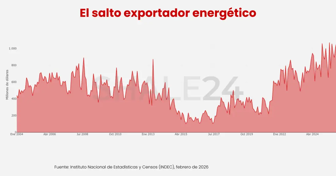 Según el último informe del Instituto Nacional de Estadística y Censos (INDEC), el intercambio comercial en combustibles y energía correspondiente a enero de 2026 arrojó un superávit de u$s 618 millones, producto de exportaciones por u$s 781 millones —que representaron el 11,1% del total exportado— e importaciones por u$s 163 millones.