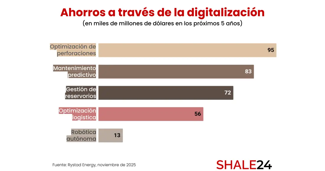 La industria del petróleo y gas podría ahorrar más de u$s320 mil millones en los próximos 5 años gracias al avance acelerado de la digitalización, según un nuevo análisis de la consultora noruega Rystad Energy. Este potencial de ahorro se concentra en 5 áreas de aplicación inmediata: optimización de perforación, robótica autónoma, mantenimiento predictivo, gestión avanzada de yacimientos y logística inteligente.