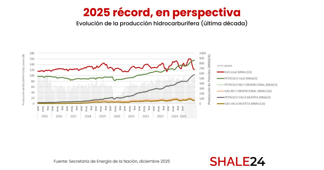 Este salto explosivo del 100% no sólo contrarrestó los implacables declives naturales del shale –que pueden alcanzar hasta un 80% en los primeros 2 años–, sino que catapultó la producción a récords históricos: el petróleo escaló un 15% interanual hasta 138.118 m³/día (con el 68% proveniente de no convencionales), mientras el gas se mantuvo estable en 131.529 Mm³/día gracias al empuje del convencional que compensó la caída del 20% en shale.