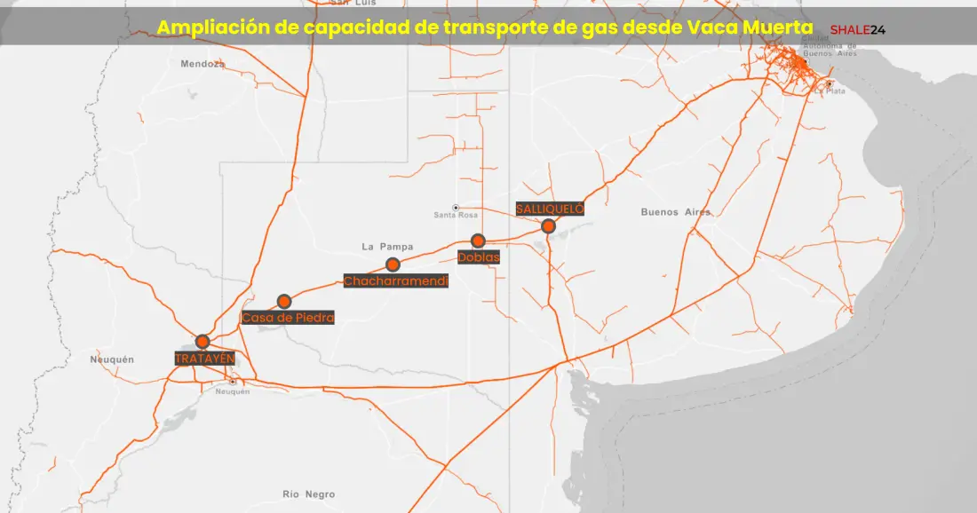 Paralelamente, y para posibilitar que el gas adicional recibido en Salliqueló pueda abastecer al Gran Buenos Aires y Norte del país, tgs se encuentra desarrollando una obra de ampliación de 12 MMm3/d de capacidad adicional en su sistema transporte regulado, que consiste en la instalación de 20 km de gasoducto paralelo al troncal y 15.000 HP adicionales en el Gasoducto Neuba III, sobre el cual se realizarán adecuaciones para operarlo a mayor presión.