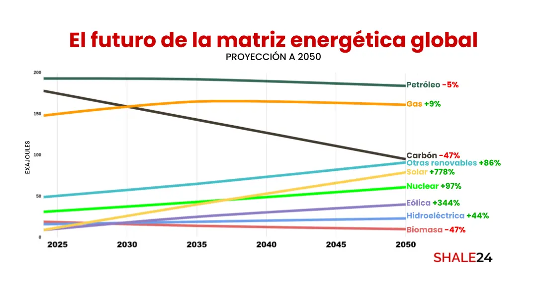Las energías renovables se convertirán en la columna vertebral del nuevo suministro, con una previsión de crecimiento superando el doble, pasando de 83 exajulio (EJ) en 2024 a 233 EJ en 2050. Esto significa que su participación en el suministro global escalará del 13% al 31%. Recuérdese que 1 EJ ≈ 277 778 GWh (gigavatios-hora) de electricidad.